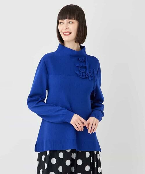 首元にスカラップモチーフをあしらった華やかなデザインが魅力。袖や肩回りは華奢に、裾に向かってほんのり広がるシルエットで腰回りを優しく包み込む女性らしい一着です。テキスタイルはさらりとソフトタッチな肌触りが心地よい、ニットならではの柔らかさ。同素材で仕立てたカーディガン【RBFLB25390】もおすすめ。