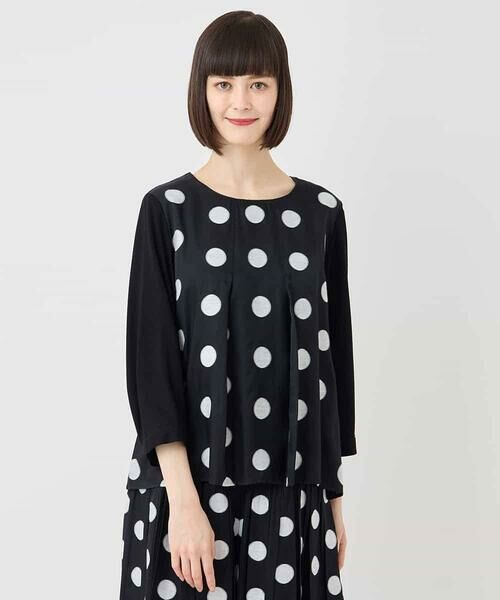 オリジナリティ溢れるドット柄が存在感を纏う一枚。後身頃と袖には、しなやかなカットソー生地をドッキングし着心地良く仕立てました。衿ぐりタックの構築的な立体感や、お袖のふんわりとしたシルエットデザインがポイント。◆ 素材 ◆