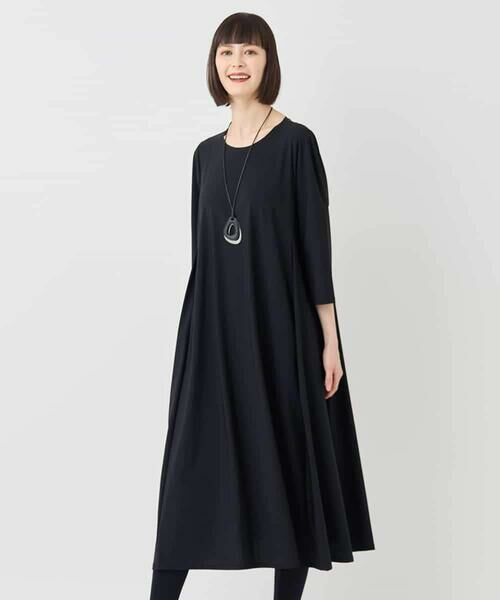 しなやかな素材感を生かしたフレアラインが美しいAラインワンピース。七分袖のスリムなシルエットに仕上げることで羽織アイテムとの着回しも効く、汎用性抜群の一着です。伸縮性に優れたテキスタイルに加え、着脱しやすいバックファスナー仕様も嬉しいポイント。※アンダードレス付き