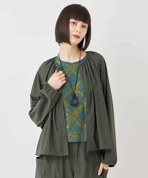 襟ぐりや袖口にたっぷりとギャザーディテールを施した大人フェミニンなショートジャケット。ボリュームラグランスリーブにショート丈で抜け感のある今年らしいシルエットを表現しました。空気のように軽やかな素材でさらっと羽織れるフロントZIP仕様も嬉しいお作り。