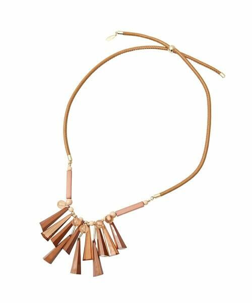 顔まわりに華やぎを与えるデザインネックレス。様々な形状の樹脂パーツやカラーリングを組み合わせた動きのあるデザインが特徴です。金属アレルギーの方にも嬉しい、合皮くるみ紐のしなやかな優しい肌当たりもポイント。同系色でまとめた上品な装いと自在に長さアレンジができるエンドパーツで、シーンを選ばず幅広いスタイルでお楽しみ頂けます。※アクセサリーパーツ・部品などの金属部分に鉛が含まれている場合があります。小さなお子様が口に入れたり誤って飲み込んだりしないように、使用や保管の際は厳重にご注意ください。
