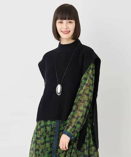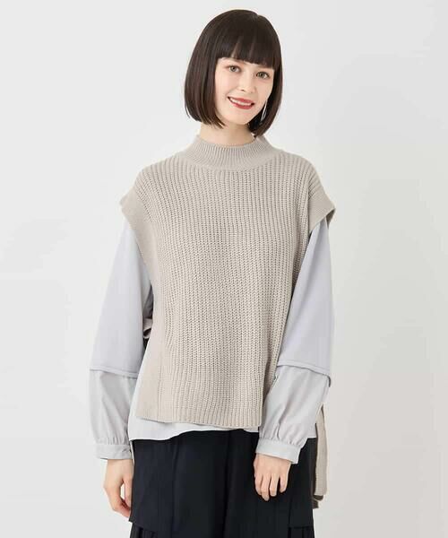 アイテム次第で着こなしの幅を広げるニットジレ◆ デザイン・おすすめポイント ◆ふっくらとしたアクリル糸で仕立てた暖かみのある一枚。身頃の立体感ある畦編みに、ネック周りのリブ編みと両脇の総針り編みを組み合わせた表情豊かなお作りです。ありそうでないボトルネックや大胆に差をつけたヘムラインが洒落感溢れる着こなしを演出。着合わせしやすいスモーキーなグレージュとシックに決まるブラックの二色展開も魅力的なポイントです。◆ 素材 ◆ふっくらとしたアクリル100%のニット生地は、ソフトな肌触りで柔らかな着心地。アウターをオンしても、かさばらないライトな肉感も嬉しいポイントです。