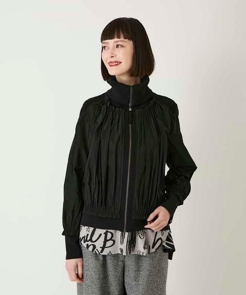光沢のあるタフタ素材にニットを組み合わせた質感のコントラストが魅力のひと品。フロントや袖にギャザーディテールを効かせることでスタイリングを華やかに印象付けます。お好きな位置でアレンジしてタートルネック風にもお楽しみ頂けるファスナーデザインも魅力。