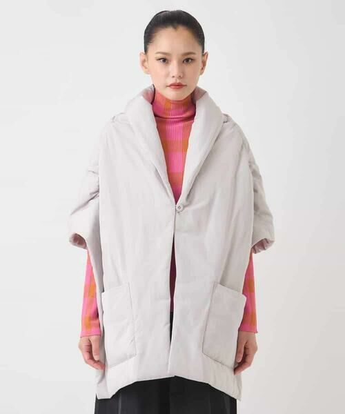 軽量素材で仕立てた寒い季節に欠かせない中綿入りストール。すっぽりと包み込む大判型で前身までしっかりと暖かく、ボタン付きで着脱しやすいお作りです。大きなポケットを両側に設け、内側のドロストコードを絞ればショルダーラインに沿ったニュアンスあるギャザーアクセントに。ワントーンカラーで着回しやすく、ライトアウター感覚で普段使いして頂けるおすすめのアイテムです。サンプルでの撮影となるため、実際にお届けする商品と仕様やサイズが異なる場合がございます。予めご了承ください。model:H172 B81 W58 H86 着用サイズ:M