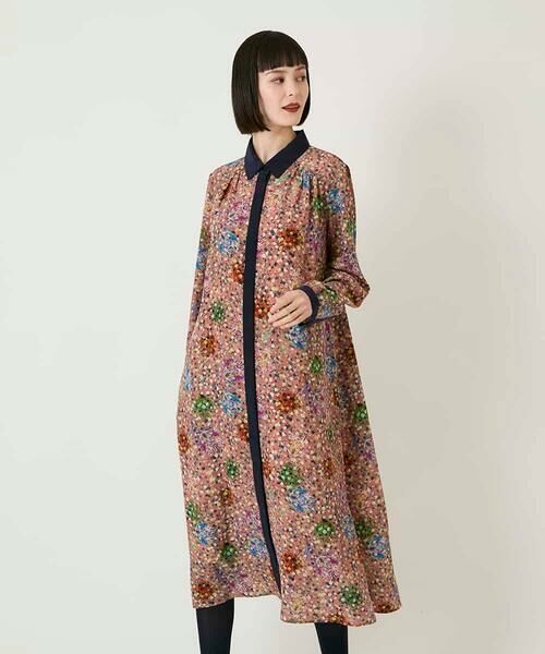 手書き風のドット柄に幾何フラワーをのせたほんのりスイートでムードあるデザインがポイントです。甘い雰囲気にプラスした衿や前立て、袖口のネイビー配色がすっきりと演出。ドレープ性のある上品なテキスタイルでドレッシーに印象付ける特別感ある一着です。※アンダードレス付き