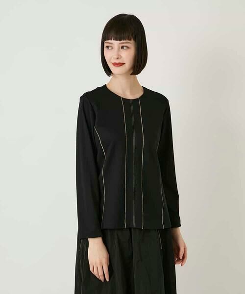 しなやかなハリ感と中肉厚のしっかりとした質感で品良く魅せてくれる着心地にも拘たお作りです。振りミシンやステッチを効かせた配色ラインがスタイルアップ効果をプラス。後ろ裾をフレアカットにすることで腰高でよりコンパクトなフォルムを強調します。品のあるトラッドなスタイリングにもおすすめ。同生地のワンピース【RBPAE42490】も人気です。※バックボタン