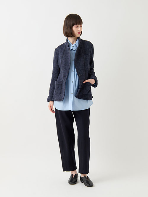 ダブルボタンにスタンドカラーのお作りがソリッドな印象のウールジャケット。薄手ながらしっかり裏地付きのお作りなので防寒性にも優れたジャケットはミックスカラーのフェルト生地で立体感を表現し、コーディネートのアクセントに最適な一枚にお仕上げしました。しっかりとダーツをとっているため着ぶくれすることなく、ユニセックスなイメージのジャケットながらフェミニンに着こなしていただける技ありデザイン。軽く羽織れるジャケットは一枚あると重宝するアイテムです。