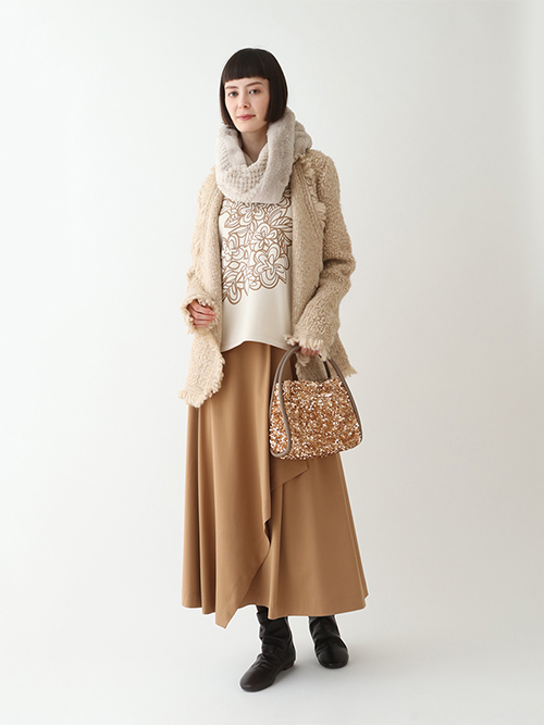 ヘアリー感のある獣毛素材で編み仕立てたデザインジャケット。ふわふわとした存在感のあるループフリンジをアクセントにした季節感溢れる仕上がりになっています。後ろ身頃には機能性の高いキルティングをジョイントして暖かさもアップ。取り外し可能な細いグログランテープリボンがスタイリングをより楽しくしてくれます。