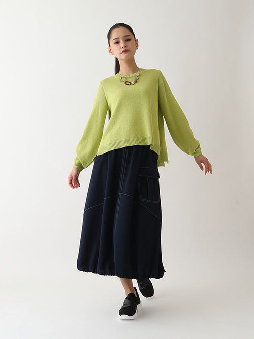 イタリアのコイルヤーンを用いた上品な光沢ラメがスタイリングのアクセントにぴったりな一枚です。カジュアルにもきれい目にも合わせやすい素材を生かしたシンプルなデザインで普段使いにも最適。アーチ状のボトムに馴染むフレアヘムラインとふっくらと可愛らしさのあるお袖もポイントです。同素材のカーディガン【RBFEV20270】もおすすめです。