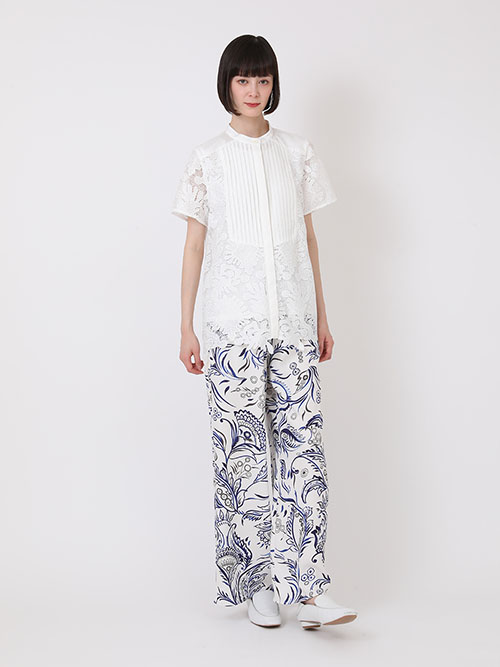 幾何柄のケミカルレースをたっぷりと前身に施した大人フェミニンなデザイン。バンドカラーに比翼仕立てでシャツライクなディテールとフロントのピンタックがキリッと引き締めるメリハリの効いたお作りです。裾レースのスカラップヘムもオシャレなポイントに。ボリュームのあるパンツと合わせたトレンド感あるコーディネートがおすすめです。