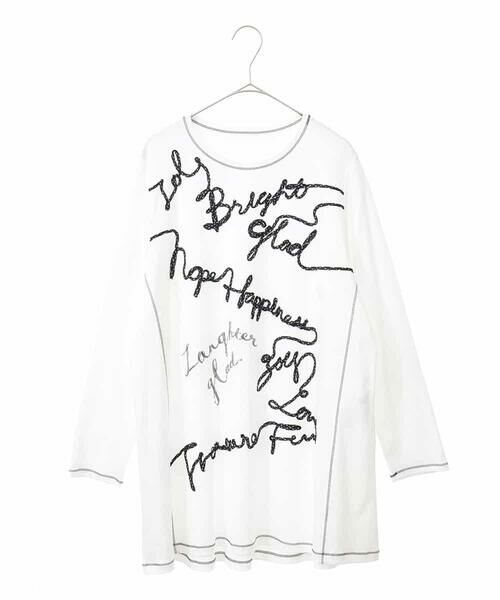 グラフィカルロゴを配色テープでコラージュしたデザイン性の高いデザインです。アウトラインにステッチを加えたライトなイメージでデイリースタイルにも最適。ラウンドネックにヒップが隠れるすっきりとしたチュニック丈がスタイリングしやすいお作りです。シンプルながらも着映えを叶えるスパイスアイテムにぴったりの一枚。