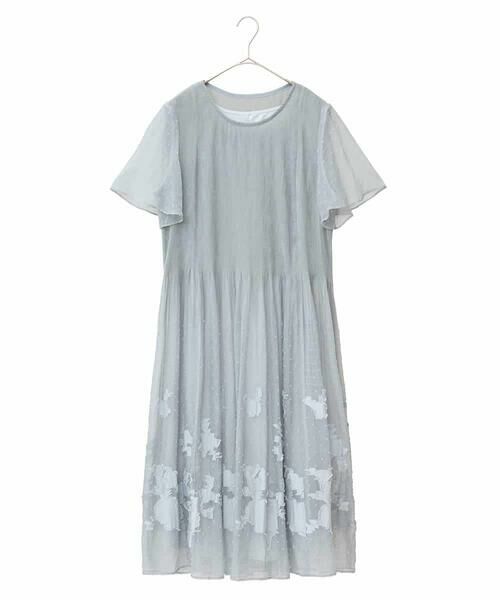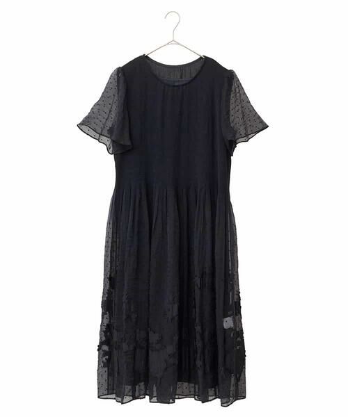 上半身は細かなシャーリングでフィット感良く仕上げ、ウエストからふんわりと広がるシルエットが魅力的。上品なドット柄に裾のフラワーモチーフが特別感をプラス。エアリーな袖を合わせた美しいバランスがスタイルアップも叶えてくれるおすすめのアイテムです。同生地を使用したブラウス【RLBGA30410】もございます。※アンダードレス付き
