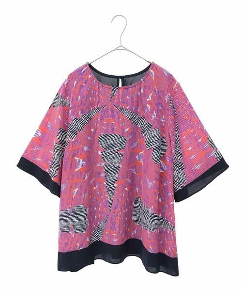 ストライプのタイルのようなクールなデザインがオリジナリティ溢れる一枚。後身に伸縮性あるジャージー生地、袖口や裾には無地のデシン素材をジョイントした異素材MIXも特徴的です。ゆとりあるフレアヘムでエアリーな軽い着心地も魅力的。夏らしい爽やかさで気分も高揚する今季おすすめの一枚です。同デザイン使用のチュニック【RLKGA10290】もおすすめ。