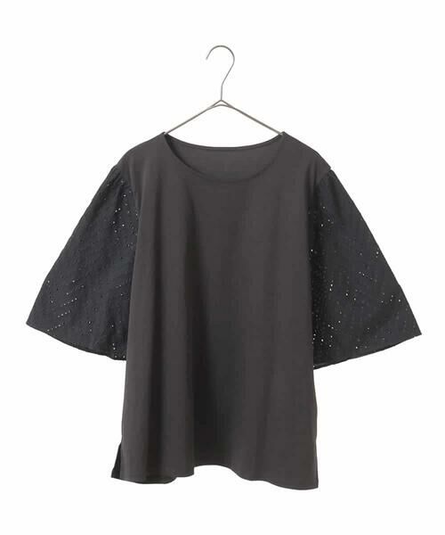 アイレットレースの立体的なフレアスリーブがトレンド感あるデザイン。身頃はあえてシンプルにすっきりと仕上げた大人エレガントな華やかさが魅力です。