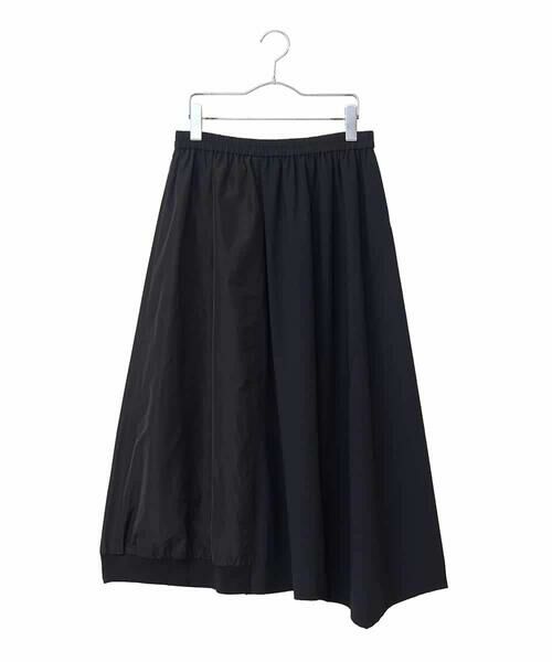 切り替えラインですっきりとしたフレアーと、裾をギャザーできゅっと絞ったバルーンの左右で異なる絶妙なシルエットバランスが特徴です。裏地付きで透け感も無く、ウエストは総ゴム仕様で着脱しやすいのも嬉しいポイント。