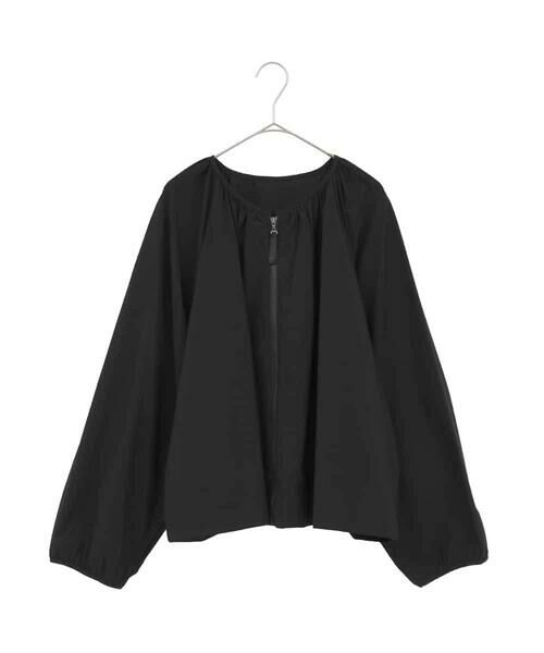 襟ぐりや袖口にたっぷりとギャザーディテールを施した大人フェミニンなショートジャケット。ボリュームラグランスリーブにショート丈で抜け感のある今年らしいシルエットを表現しました。空気のように軽やかな素材でさらっと羽織れるフロントZIP仕様も嬉しいお作り。