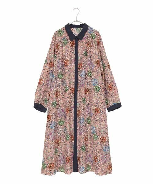 手書き風のドット柄に幾何フラワーをのせたほんのりスイートでムードあるデザインがポイントです。甘い雰囲気にプラスした衿や前立て、袖口のネイビー配色がすっきりと演出。ドレープ性のある上品なテキスタイルでドレッシーに印象付ける特別感ある一着です。※アンダードレス付き
