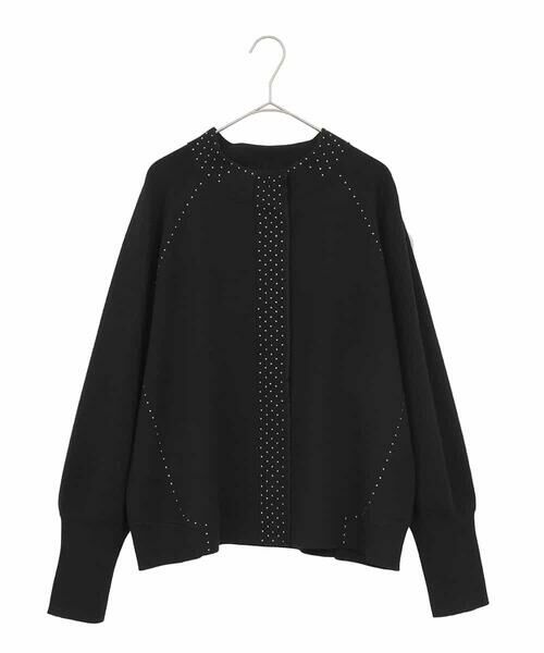 端正さ漂うブラックカラーのニットにきらりと輝くスタッズが上品なアクセントを加えた一枚。ゆったりとした着心地ながら、裾にかけてややスリムなフォルムがさりげなくスタイルアップ効果を後押しします。袖口と裾サイドにジョイントしたリブが程よくカジュアルさをプラス。どんなボトムにも合わせやすく、さらりと羽織るだけでエレガントムードを引き立てるおすすめのアイテムです。