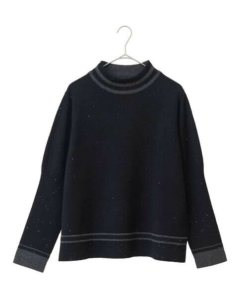 毛をベースで仕立てたふっくらとした手触りが魅力的な一枚。極小のスパンコールを散りばめた上品な光沢を魅せるユースフルなお作りです。裾や袖口、ハイネックボーダーの配色アクセントやリブ使いもビスならでは。
