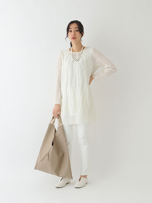 ぽこぽこと立体感を出した花柄モチーフをジャカードで表現したチュニック。ふんわりとしたシルエットながらネック周りやバックにギャザーやシャーリングを施して広がりを抑えたすっきりとしたフォルムになっています。袖口やヘムラインに施したメロー始末が大人フェミニンなアクセント。優しいニュアンスを加えてくれるインナーとしても合わせて頂けるおすすめのアイテムです。※アンダーノースリーブ付き。