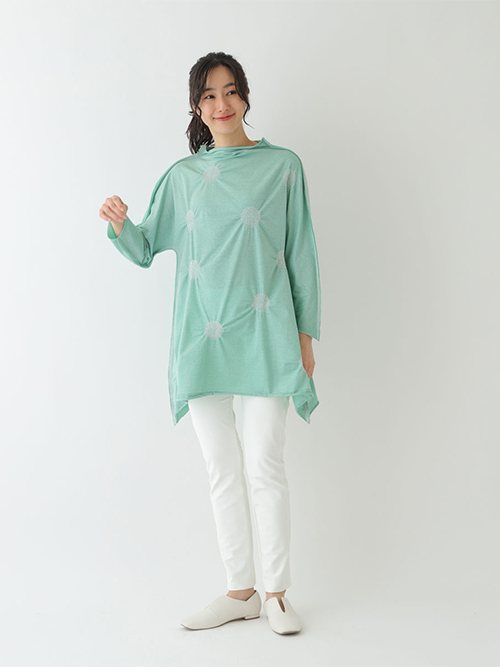 春らしい爽やかな配色ニットで仕立てたプルオーバー。ポイントのサークル模様を編み地で表現した伸縮ディテールが他にはないオリジナルなデザインになっています。本来内側に仕立てる縫い代部分を表側に出し、ステッチのように編み留めた個性的なカットもおしゃれなポイント。緩やかなAラインでゆったりと着て頂けるデイリー使用にもぴったりのアイテムです。