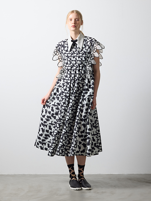 モノトーンなアニマルコラージュをプリントした総柄デザインワンピース。袖の切り替えラインには個性的なモチーフ刺繍をジョイントしてさらに印象的に仕立てました。前後サイドとタックプリーツで立体感を加え、メリハリのあるシルエットを演出。ユニークなラインの襟元は異素材なだけでなく、取り外し可能でニュアンスチェンジができるのもポイントです。無地タイプ【RHEHW31790】 もおすすめ。※フロントハーフファスナー、インナー付きmodel:H172 B80 W58 H88 着用サイズ:M