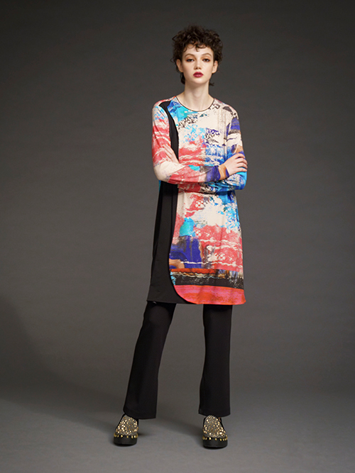 ストレッチ性のある合成繊維ジャージーで仕立てたチュニック。コレクションからくる絵画タッチの図案をインクジェットプリントした色鮮やかなカラーリングが目を惹きます。すとんと落ちるドレープのあるラインと、サイドにレイヤードしたような無地配色の切り替えがポイント。コンパクトなボトムやレギンスを合わせてスタイルアップも叶うおすすめな一枚です。同じシリーズでお作りしたハイネックカットソー【RHKCA02390】 もおすすめ。model:H170 B77 W58 H85 着用サイズ:M