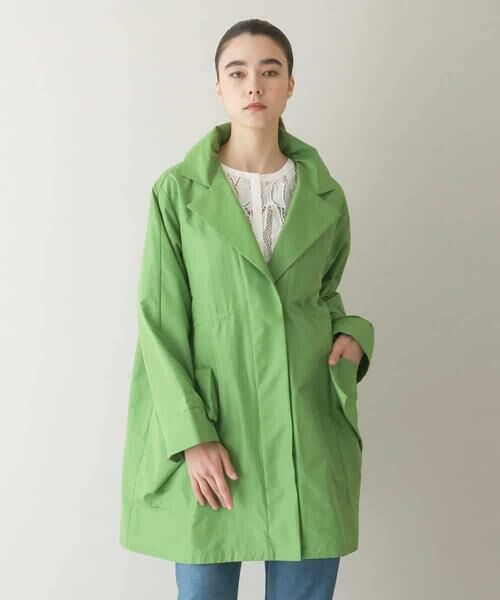 さっと羽織るだけでこなれ感を演出できる大人カジュアルなスプリングコート。柔らかな風合いのトリアセテート混素材で軽やかな着心地でありながら、程よいハリとブライト感が上品な印象を残すひと品です。身頃から一枚で仕立てた、折り紙テクニックの大きなポケットがヒロコらしいデザイン。ミドル丈で着合わせしやすく、ウエストに配したドロストでスタイルに合わせたシルエットアレンジをお楽しみいただけます。同素材で仕立てたドロストカーブラインスカート【RHHFA40590】 やドロストデザインスプリングコート【RHUXA40110】 もおすすめです。model:H172 B80 W58 H88 着用サイズ:M