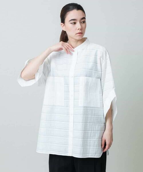リラックス感あるシルエットでこなれ感たっぷりに演出してくれるシーズナルなデザイン。胸元の大きめポケットや動きのあるカフスで特徴的に仕上げ、シンプルながらもこだわりが詰まっています。ナチュラルで涼し気な素材感とシルバーのラインを合わせたクールな雰囲気もポイント。シャープな首元から緩やかなカーブのヘムラインまで絶妙な抜け感で特別感ある装いに。
