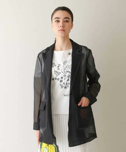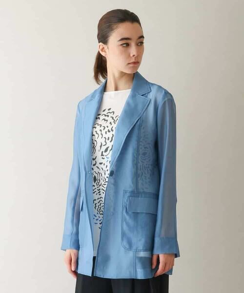 こなれ感あるモードなスタイルを演出してくれる旬のシアージャケット◆ デザイン・おすすめポイント ◆清涼感のある程よい透け感で軽やかな着心地が嬉しいシーズナルな仕立て。構築的なきちんと感あるシルエットに配色ステッチがシャープに演出。大きなポケットや立体的なフラップディテールもおしゃれなアクセントです。ひとつ留めボタンで楽に着脱でき、カジュアルスタイルをリッチにブラッシュアップしてくれる今季おすすめのアイテムです。model:H172 B80 W58 H88 着用サイズ:M◆ 素材 ◆ポリエステルオーガーンジーを使用した軽量で風合い優しいテキスタイル。落ち着いた透け感で品良く魅せてくれるブラウスライクな作りです。