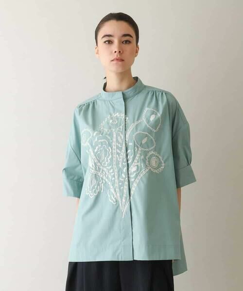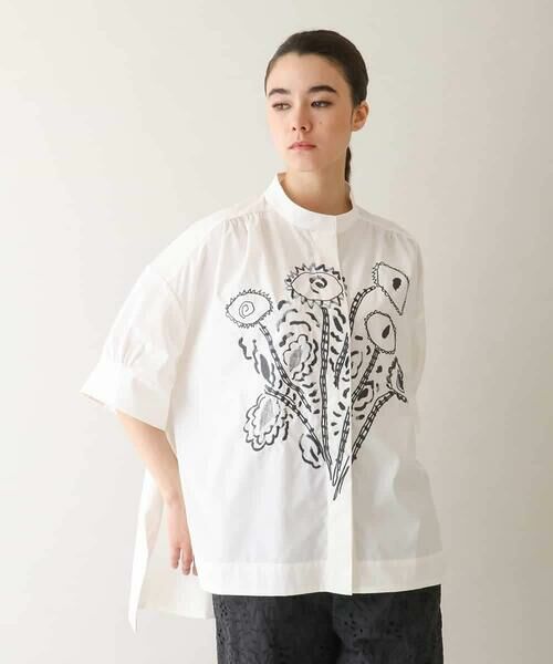 大胆なフラワー刺繍がアクセントのマルチに使えるオリジナルブラウス◆ デザイン・おすすめポイント ◆アート画の花束を刺繍で立体的に表現した手の込んだデザイン。ワイド幅のBIGフォルムにコンパクトなギャザー袖を合わせたこなれ感あるシルエットが魅力です。サイドスリットの入った前後差のある裾が爽やかさをプラス。一枚で着用するのはもちろん、羽織りとしてレイヤードするのもおすすめです。model:H172 B80 W58 H88 着用サイズ:M◆ 素材 ◆コットン、ポリエステルのさっぱりとハリのあるテキスタイルを使用。程よくきちんと感のある大人スタイルに最適です。