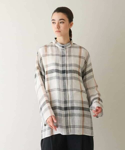 ナチュラルなリネン素材を使用したシーズナルなアイテム。優しいカラー配色のBIGチェック柄が一枚でも存在感たっぷりに演出します。バックタック入りのリラクシーなフォルムながらバンドカラーでキリッと引き締めたモードな雰囲気が洒落感あるポイント。前を開けて羽織りとして合わせるのもおすすめです。同素材のスカート【RHHGB24980】 も人気のひと品。