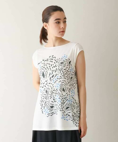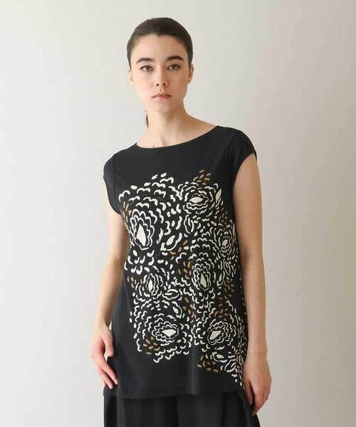 とろみ滑らかな軽い着心地が嬉しいカジュアルな一枚。前身頃から後ろまで続くモチーフの配置までこだわったヒロコならではのデザインです。切り替えでレイヤード風に見せたフレンチスリーブや抜け感あるサイドスリットヘムも特徴的。スタイリングのアクセントとしても活躍し、ジャケットのインナーにも適したアイテムです。チュニック【RHPGC29490】 もおすすめ。