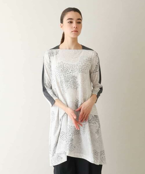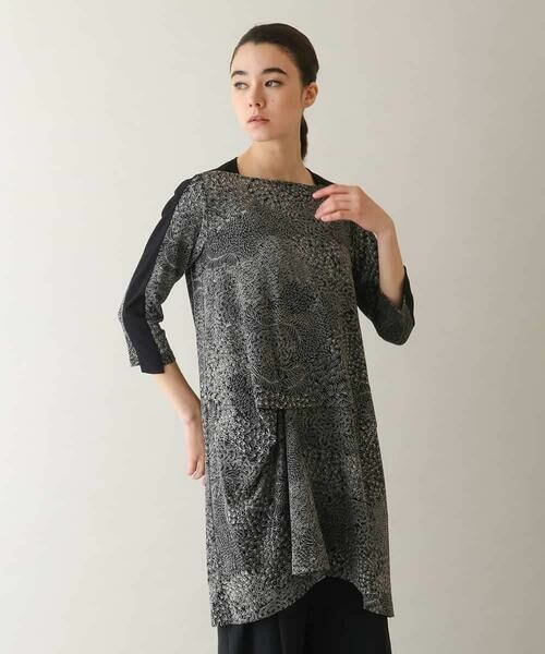 線画タッチで繊細に描かれたツートンの松葉柄が個性的なデザイン。ネックラインから袖にかけて異素材リブを切り替えたコントラストのある引き締めディテールがポイントです。ウエストラインに大きなタックを施し、サイドに流れるドレープフレアですっきりとしたシルエットを演出。コンパクトなパンツと合わせるだけで美しいスタイリングが完成します。同デザインのプルオーバー【RHKGB07360】 もおすすめ。