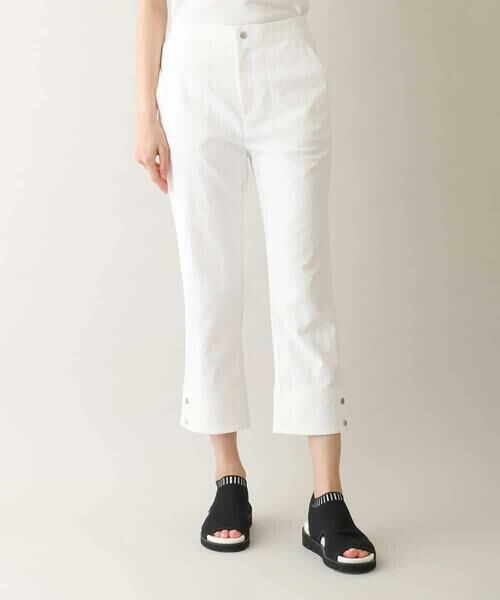 カフスのように切り替えた裾のドットボタンが目を惹くパンツ◆ デザイン・おすすめポイント ◆こだわりのディテールで細見え効果も期待できるおすすめのひと品。脇線をやや前寄りに切り替え、すっきりとしたくるぶし丈でレッグラインを美しく演出します。程よく伸縮性があり、バックウエストはゴム仕様のためリラクシーな穿き心地なのも魅力的。シーズンムード高まるカラー展開にも注目です。model:H172 B80 W58 H88 着用サイズ:M◆ 素材 ◆ドライタッチな糸と絹麻の糸を組み合わせた柔らかな風合いが特徴的な素材での仕立て。白や単色でも透けにくい加工を施し、快適に着用できます。どんなトップスとも相性が良く、合わせ方次第でロングシーズン活躍します。