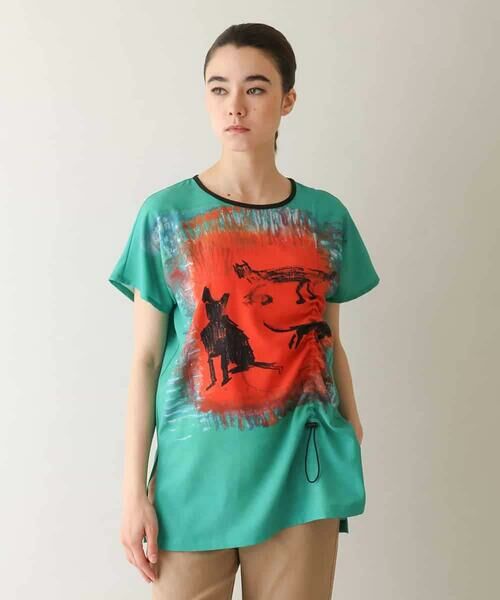 物語の様なプレイフルなアートワークが特別感のあるひと品。襟ぐりにはブラックの布帛をパイピングし、配色アクセントを効かせました。落ち感のあるシルエットに女性らしいフレンチスリーブを合わせたリラクシーな雰囲気も魅力的。長めのレングスに色彩豊かな絵柄が映え、一枚さらっと着るだけで印象的なスタイリングに仕上げてくれます。同シリーズのカットソー 【RSKGB13360】 、シャツ 【RSTGB11490】 もおすすめ。