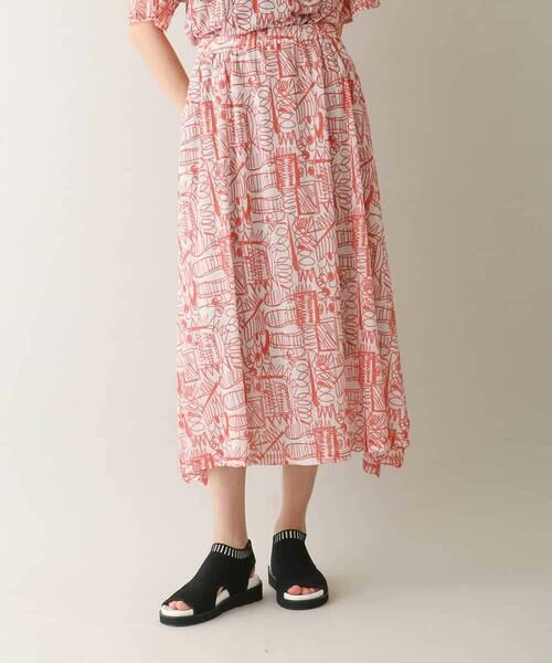 デザイナーが描いた絵画の風景を幾何柄に落とし込んだ特別感のあるひと品。ドレープ感のあるAラインシルエットが女性らしいデザインです。ハンカチの角を垂らしたようなヘムラインもこだわりのポイント。型崩れしにくく、ウエスト総ゴム仕様でリラクシーに着ていただけます。同素材のプルオーバー 【RSKGB04290】 とのセットアップの着こなしもおすすめ。ポロチュニック 【RSPGB05360】 もございます。※アンダースカート付き