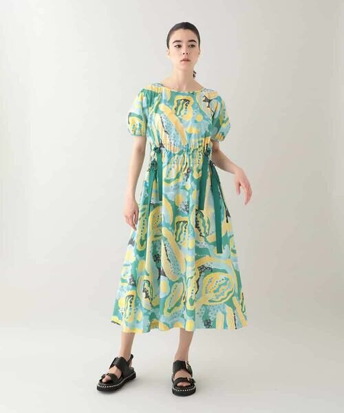ヒロココシノらしいアーティスティックなプリントを鮮やかなカラーリングで表現したひと品。グログランリボンをリングで結ぶ一癖あるウエストデザインが目を惹き、ゴム入りでリラクシーな着心地ながらスタイルアップ効果も期待できます。程よくふんわりしたパフスリーブが大人フェミニンな雰囲気を演出。デイリーユースはもちろん、ちょっとしたお出かけやパーティーシーンまで活躍するおすすめのアイテムです。同プリントを施した【RHPHB05560】 もおすすめ。