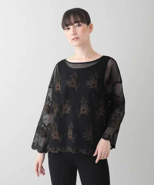 HIROKO KOSHINO / ヒロココシノ シャツ・ブラウス | ボタニカル刺繍チュールブラウス/日本製/洗える(ブラック)