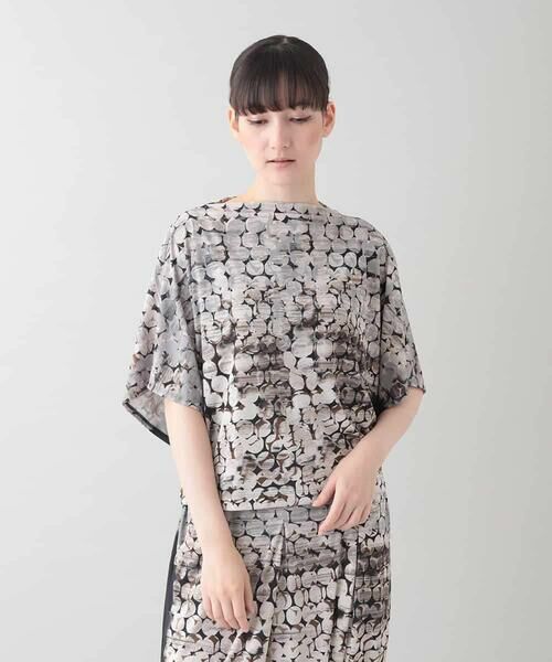 薄手のジャージー生地にブラウンや黒、グレーのニュアンス柄をプリントしたシックなデザインに仕上げました。気になる二の腕をカバーする長めの袖丈や、着痩せ効果をプラスする脇部分の黒無地切り替えもこだわりのポイント。ゆったりとしたストレスフリーなシルエットでデイリー使いしやすく、同シリーズのパンツ【RHQIB15540】 と合わせるとより個性的なコーディネートを楽しめます。ワンピース【RHPIB15790】 もございます。