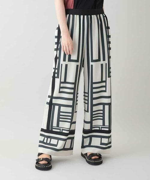 脚のラインをすっきり見せるストレートシルエットに縦長をイメージした幾何柄をデザイン。大人モードな印象のカラーリングで様々なアイテムに馴染みやすいのも嬉しいポイントです。さらっとした肌触りの軽やかな素材に、ウエストゴム仕様のイージーな穿き心地。大人っぽく着用できる柄パンツは旅行やお出かけシーンなどこれからの季節に重宝するおすすめのアイテムです。