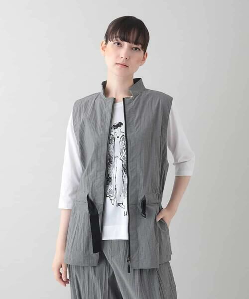 無地ライクなギンガムチェック生地で仕立てたベスト◆ デザイン・おすすめポイント ◆前立て裏に施した配色テープをアクセントに、顔まわりをすっきりと魅せる小ぶりのスタンドカラーがポイントです。Dカン留めのウエストテープをシェイプする事で、ギャザーを寄せたシャープなシルエットにもアレンジ可能。さらっと羽織れる軽い着心地で夏のレイヤードスタイルを盛り上げるおすすめのひと品です。同素材のパンツ【RSLIB14560】 とワンピース【RSEIB13690】 もございます。model:H170 B77 W58 H85 着用サイズ:M◆ 素材 ◆ワッシャー加工を施した細かいギンガムチェック素材で凹凸のある生地感が特徴です。ベタつかず肌離れの良い涼やかな着心地も魅力。