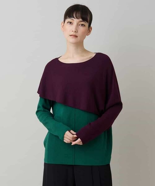 ウール×レーヨンならではのしなやかでエレガントな風合いが大人の女性らしさを引き立てる一枚。アシンメトリーにレイヤードされたデザインが自然に体型カバーを叶えつつ、モードな雰囲気を演出します。ディープなパープル×グリーン、シックなブラック×ベージュの独創的なカラーリングにも注目。やや薄手のニット素材で秋シーズンに重宝する、旬のアイテムです。同素材で仕立てたカーディガン【RHSLB50690】もございます。