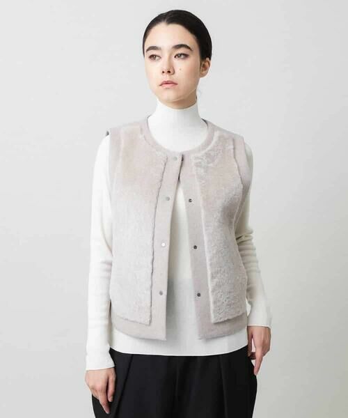 前身はリバー素材とムートンファーの切り替えで立体感を持たせ、後身はカシミヤ混のリバーコート素材をジョイント。立体感もありながら軽やかな着用感が魅力です。スナップ仕様でさっと羽織れる気軽さも嬉しいポイント。ニットやブラウスに重ねるだけで洗練された冬のレイヤードスタイルを叶えます。