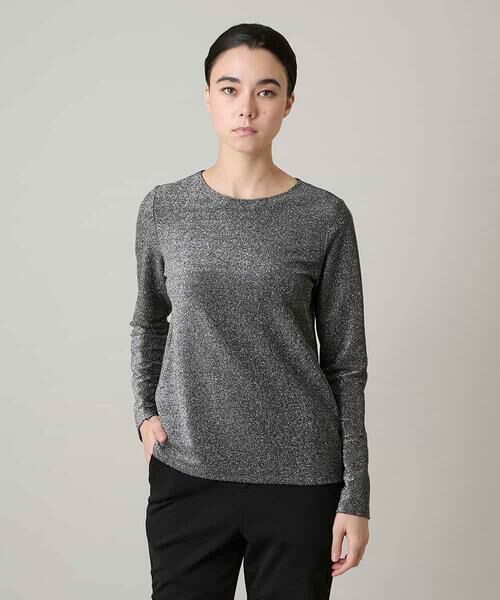 縦横にストレッチの効いた快適な着心地が嬉しいジャージー素材のベーシックな一枚。コンパクトな首元とソフトフィットなロングスリーブでインナー使いに最適なデザインです。上品なラメ感でモードになりすぎず、エレガントな装いにも好相性。様々なボトムと合わせられる汎用性の高いアイテムです。