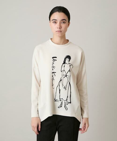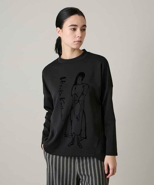 デザイナーが描いたイラスト画を単色フロッキープリントで再現したオリジナリティある一枚です。切り替えを施した丸みのあるフォルムは後ろ下がりでヒップラインを包み込み、広がりも抑えられアウターとも相性抜群。ハイストレッチの落ち感ある生地でリラクシーに合わせていただける今季おすすめのアイテムです。