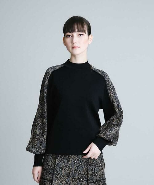 しっとりとしたハイゲージニットが上品な印象のプルオーバー。袖には繊細なタッチで描かれたアーティステイックな小花パターンの布帛を切り替えてフェミニンなアクセントをプラスしました。トレンド感抜群のハイネックにショート丈で、若々しくスタイリングしていただけます。同じプリントのスカート【RHHEP13490】とのスタイリングがおすすめです。model:H170 B77 W58 H85 着用サイズ:M