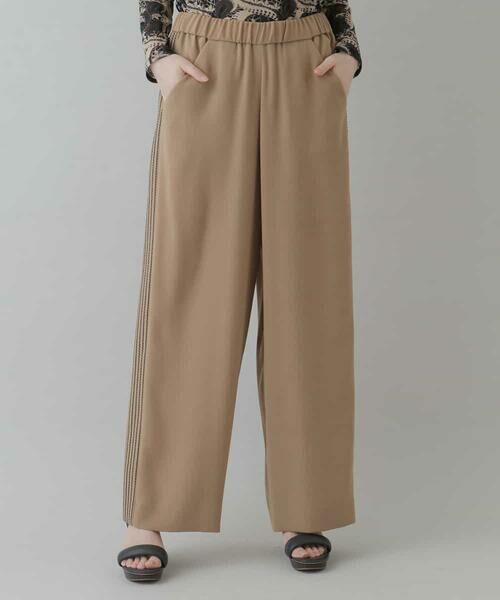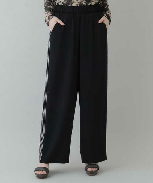 肌触りの良いバックサテンを用いた、エレガントなサイドラインパンツ。サイドには刺繍風のステッチを施し、シンプルながら特別感のある一本に仕上げました。ウエストゴムのイージーな仕様感がエレガントとエフォートレスを両立。合わせるトップスで雰囲気をがらっと変えてくれる着回しやすいパンツです。同シリーズでお作りしたブラウス【RHBFP38720】スカート【RHHFP38580】もございます。