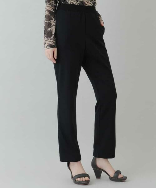 ストレッチの効いた穿きやすい細ストレートパンツ。落ち感の良いエレガントな素材感と、清涼感のある肌触りが魅力です。ウエストはコンフォータブルなゴム仕様ながら、細かいステッチのディテールが上品な印象に。サイドに配した別布のパイピングディテールが縦のラインを強調し、スッキリとしたシルエットを引き立てます。model:H170 B77 W58 H85 着用サイズ:M