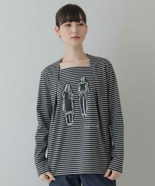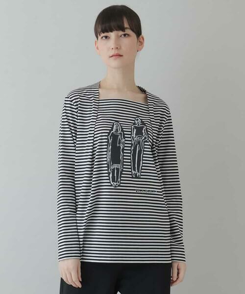 インナーはもちろん、一枚着としても重宝するオリジナルボーダーカットソー。スクエアーネックからタックを入れて立体感を出した技有りのデザインになっています。フロントにはヒロココシノ最新のイラストをレイアウト。コットン100%の軽やかな着心地はシーズン問わずおすすめです。model:H170 B77 W58 H85 着用サイズ:M